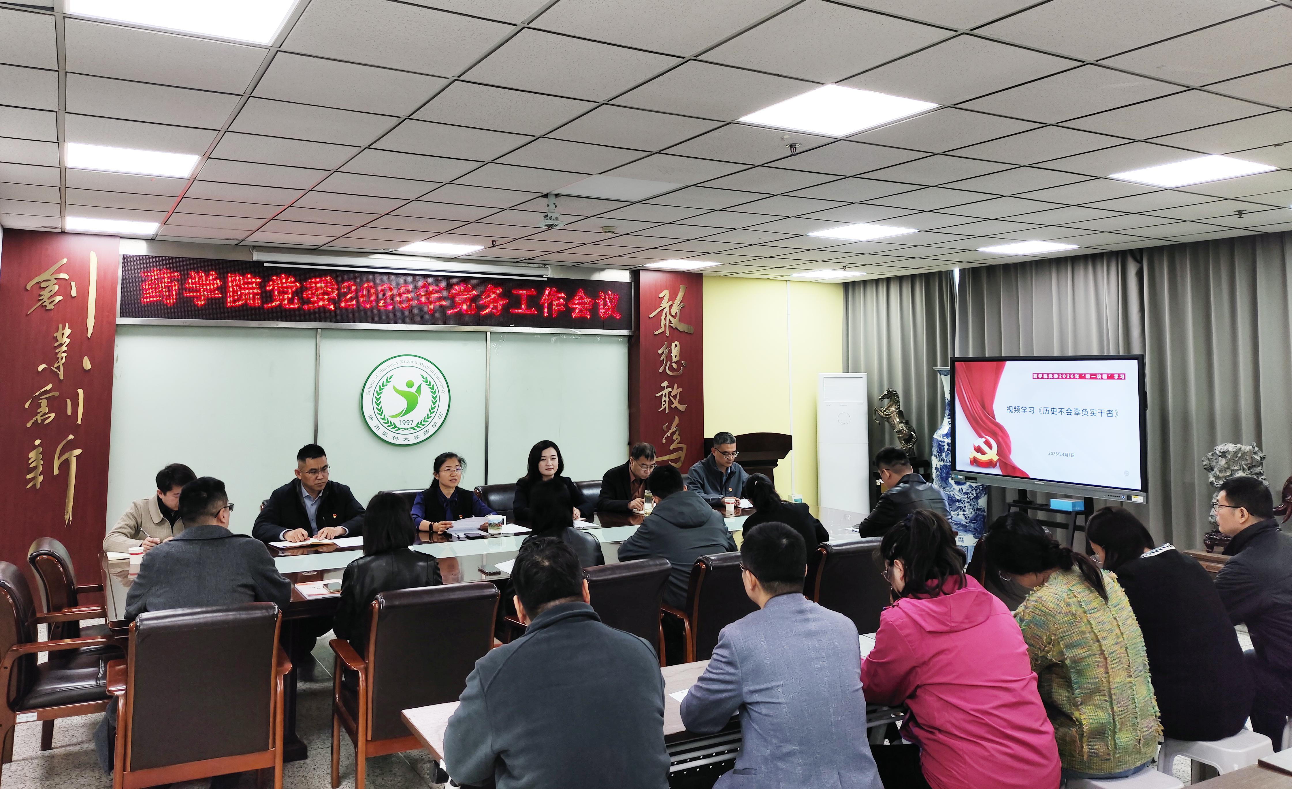 4月1日上午,药学院党委召开2026年党务工作会议。药学院党委书记韩爱侠主持,院党委委员、专职组织员、党支部书记和支部委员参会。会议集中观看了纪录片《历史不会辜负实干者》。会议强调要深入学习贯彻习近平总书记关于“实干兴邦”的重要论述,紧密结合树立和践行正确政绩观学习教育,坚持立德树人根本任务,将实干精神融入办学治院全过程,引导广大教师潜心育人、激励学生立志成才,为助力高水平医科大学建设贡献力量。会上...
