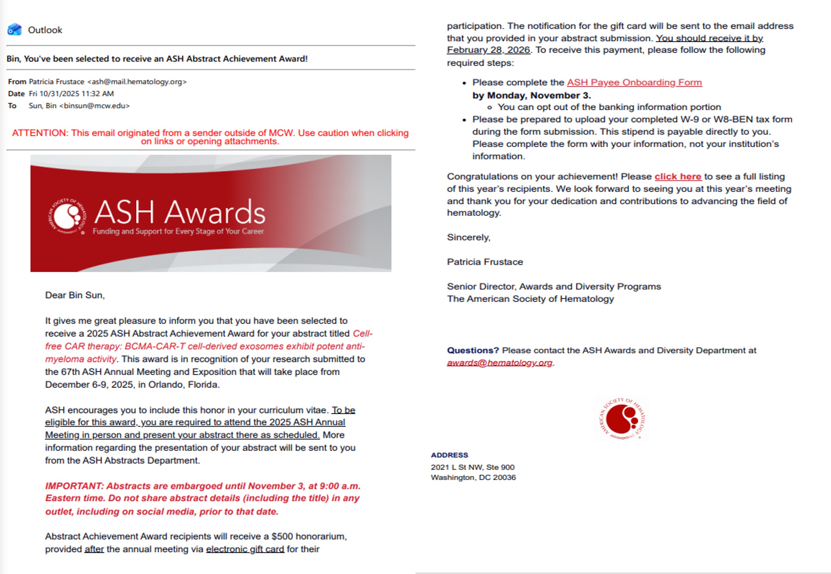 近日,第67届美国血液学会(ASH)年会正式公布2025年度优秀摘要奖名单。我院微生物与生化药学专业2023级研究生孙彬(导师齐素华教授)凭借题为《Cell-free CAR therapy: BCMA-CAR-T cell-derived exosomes exhibit potent anti-myeloma activity》(BCMA-CAR-T细胞展现强效抗骨髓瘤活性)的创新性研究,从全球近万名学者的投稿中脱颖而出,成功斩获优秀摘要奖。