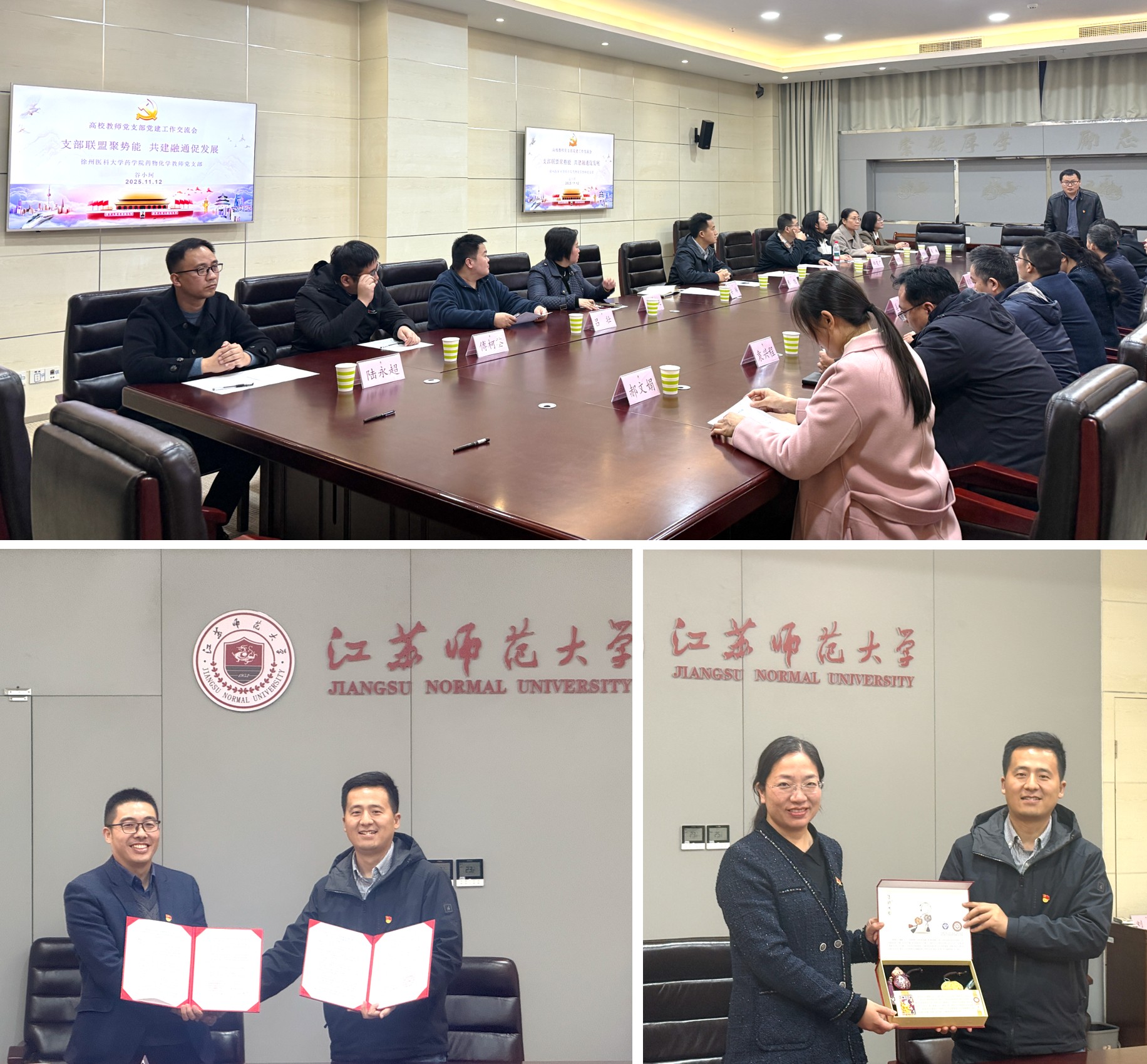 座谈结束后,我院生物有机化学教师党支部书记朱旭教授与江苏师范大学化学与材料科学学院教工第一党支部书记姜波教授代表双方共同签署了《共建协议书》,进行了纪念品互赠,并参观了江苏师范大学分析测试中心以及校级示范科研平台实验室。