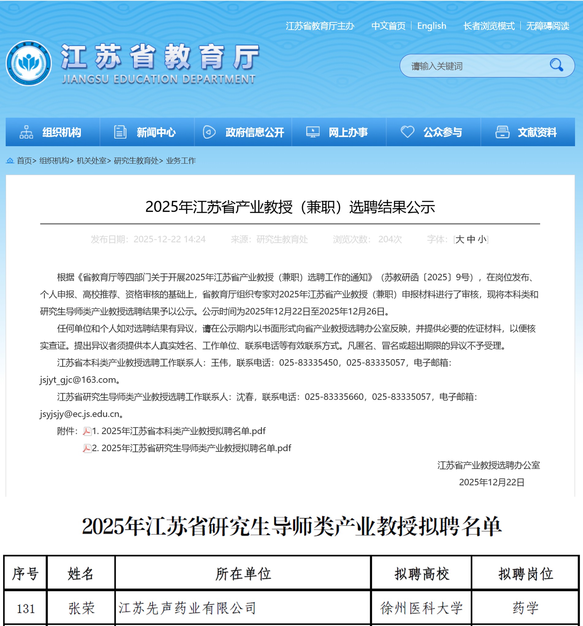 近日,江苏省教育厅公布2025年江苏省产业教授(兼职)选聘结果,我院推荐的江苏先声药业有限公司临床药理总监张荣成功入选研究生导师类产业教授。