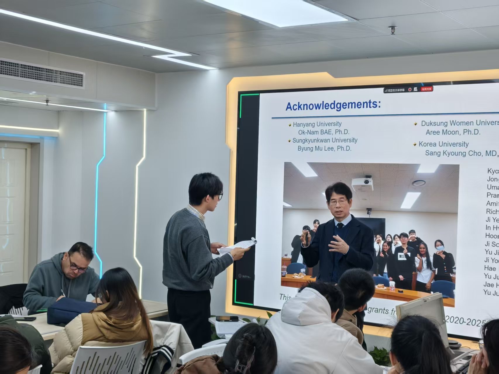 在校期间,韩国专家团还为我校本科生及留学生奉献了三场精彩的国际授课,让学生们感受“世界名师医药讲坛”的魅力。成均馆大学药学院院长Kim Hyung-Sik教授主讲《Functional Role of Pyruvate Kinase M2 in the Reprogramming of Cancer Cell Metabolism》,仁济大学医学部Han Jin教授主讲《Exercise-Induced Cardiac Adaptation》,首尔大学医学部Zhang Yin-Hua教授主讲《Why Hypertension is No. 1 Silent Killer?》。三位教授授课风格各具特色,有的热情洋溢、瞬间点燃课堂氛围,有的沉稳细腻、循序渐进传递新知。课堂上,学生们思维活跃、互动积极,在轻松愉悦的氛围中高效汲取核心知识。课后,同学们怀着浓厚求知热情,就专业前沿问题、学术研究方向及海外深造路径等与教授们进行深入交流,收获满满。此外,英国萨里大学以及国内部分兄弟院校师生通过线上方式参与了本次国际教学活动。
