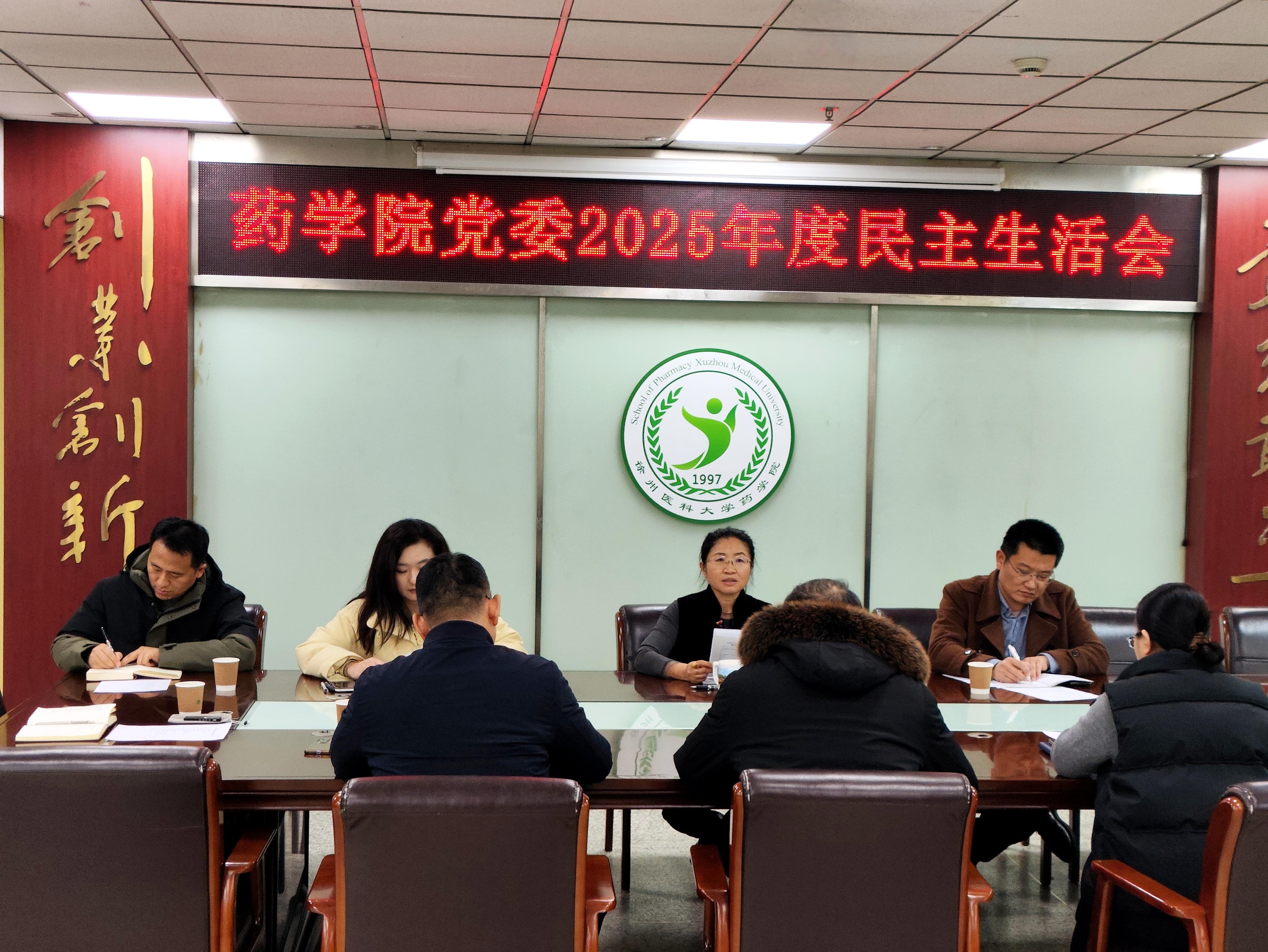 1月22日上午,药学院党委领导班子召开2025年度民主生活会。学院领导班子全体成员和专职组织员参加会议,跟岗锻炼干部列席会议,第二临床医学院党委书记刘立忠到会督导。会议由药学院党委书记韩爱侠主持。