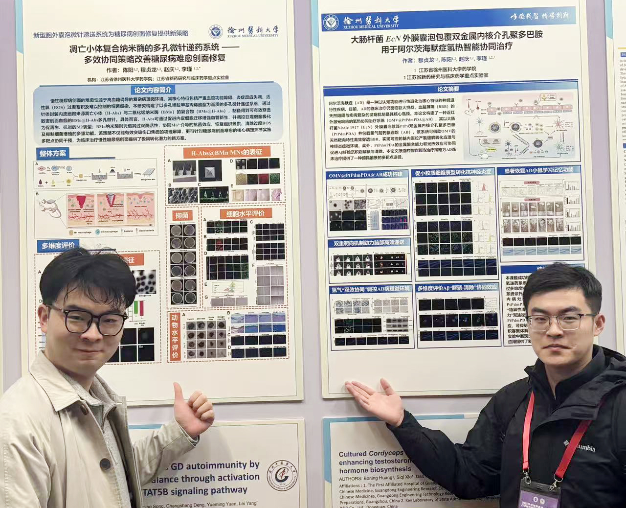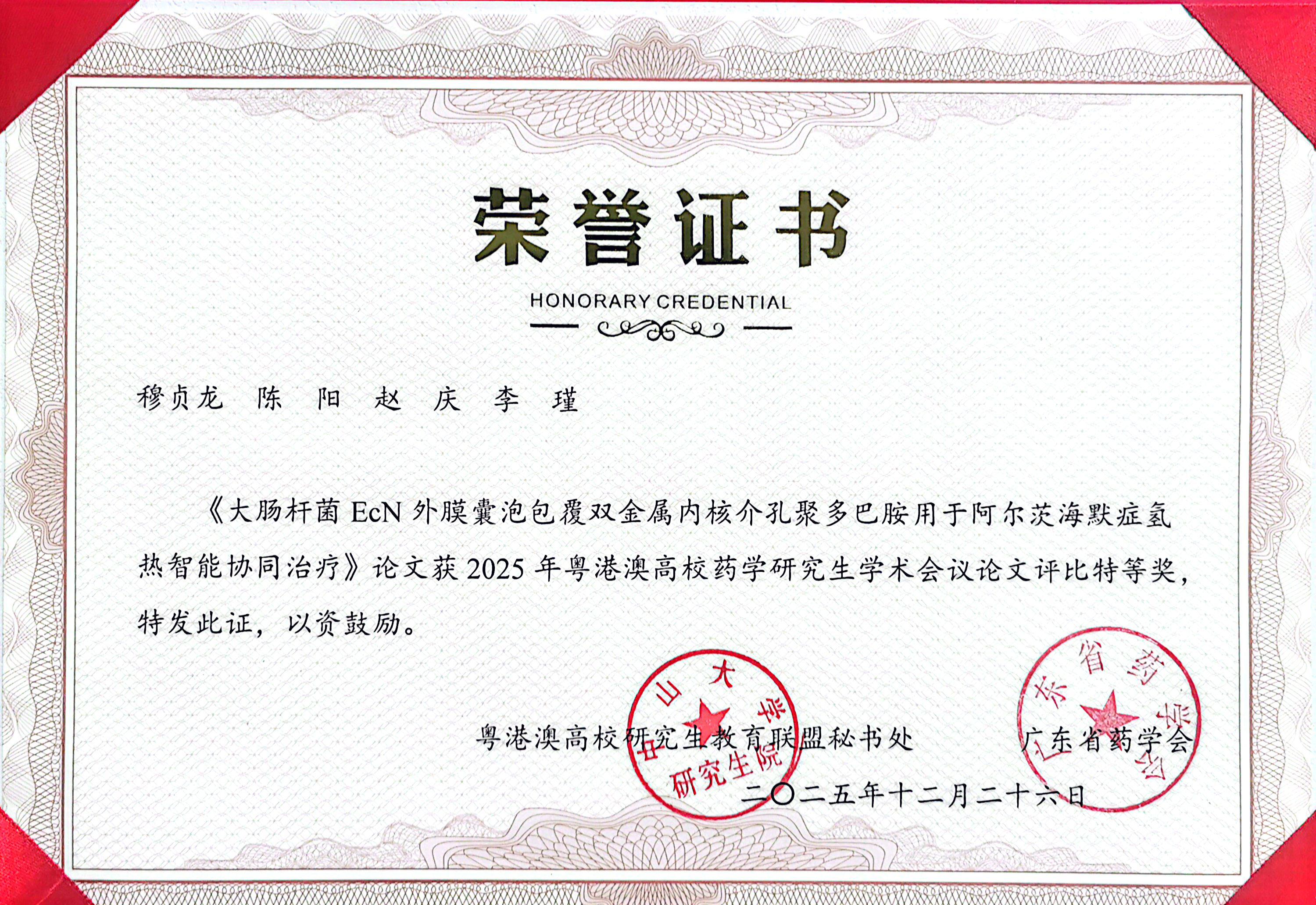 我院药剂学专业两名研究生论文成功入选现场展示并斩获佳绩。其中,2024级药剂学专业研究生穆贞龙的论文《大肠杆菌EcN外膜囊泡包覆双金属内核介孔聚多巴胺用于阿尔茨海默症氢热智能协同治疗》荣获特等奖,2023级药剂学专业研究生陈阳的论文《多孔微针传递凋亡体伪装的纳米酶,通过促进血管生成、抗炎和细菌消除来促进糖尿病伤口修复》荣获二等奖。此外,基于我院学生的出色表现,以及学院在会议组织中展现出的高效有序,我校获评“优秀组织单位”。