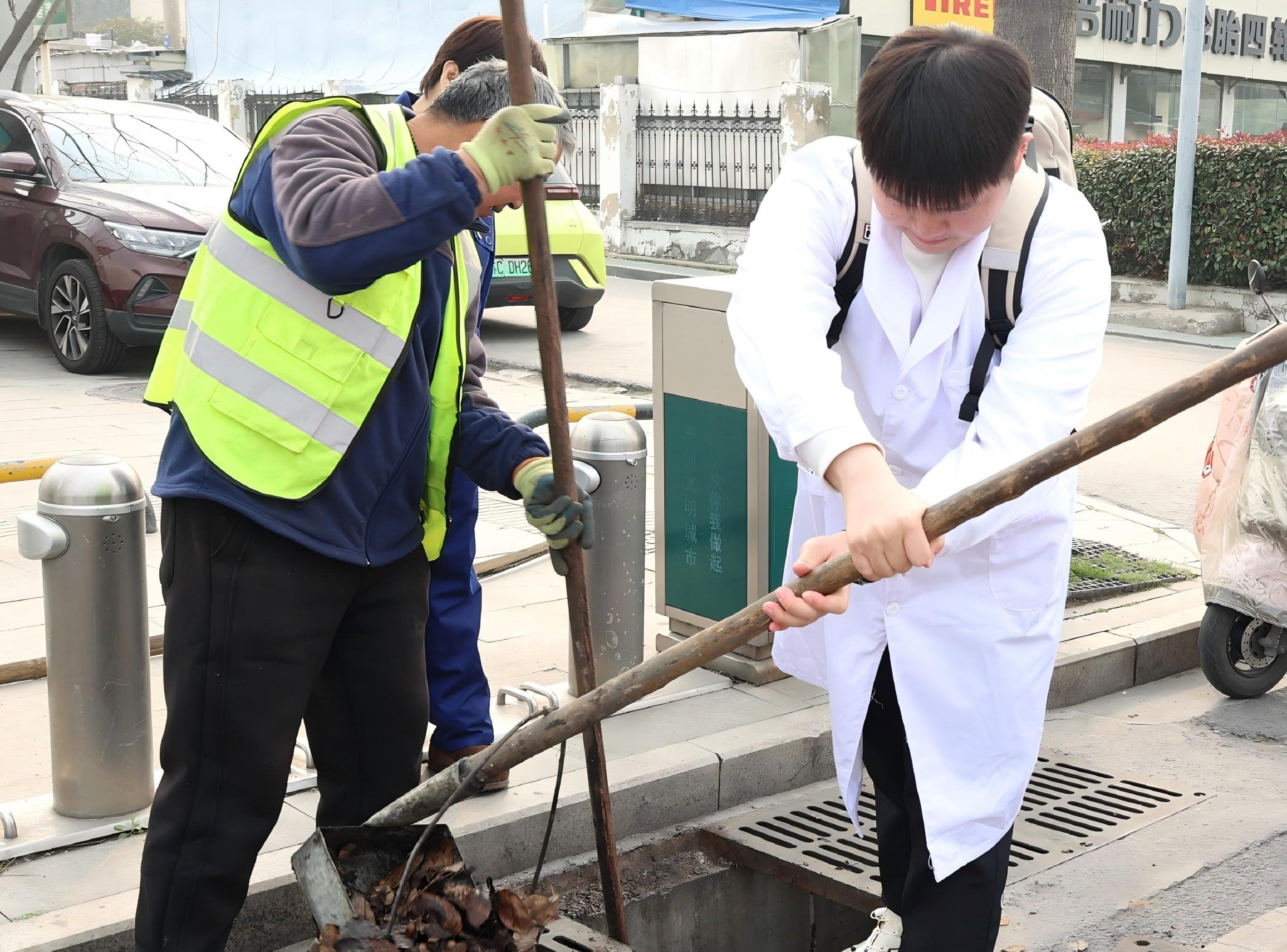 走出展厅、走向一线,这堂“行走的大思政课”进入实操阶段。师生们在四班职工指导下,穿戴工装参与窨井清淤等无风险岗位实操,真切感受一线工作者扎根岗位的艰辛与不易。同时,学生们充分发挥药学专业优势,践行“专业赋能+社会服务”理念,现场为四班职工开展用药咨询服务,并发放精心准备的“药学健康礼包”,用实际行动为基层工作者的健康保驾护航。从学习感悟到服务实践,从接受精神洗礼到主动奉献社会,这堂行走的思政课真正实现了思政教育与实践育人的深度融合,构建了流动的“移动课堂”。