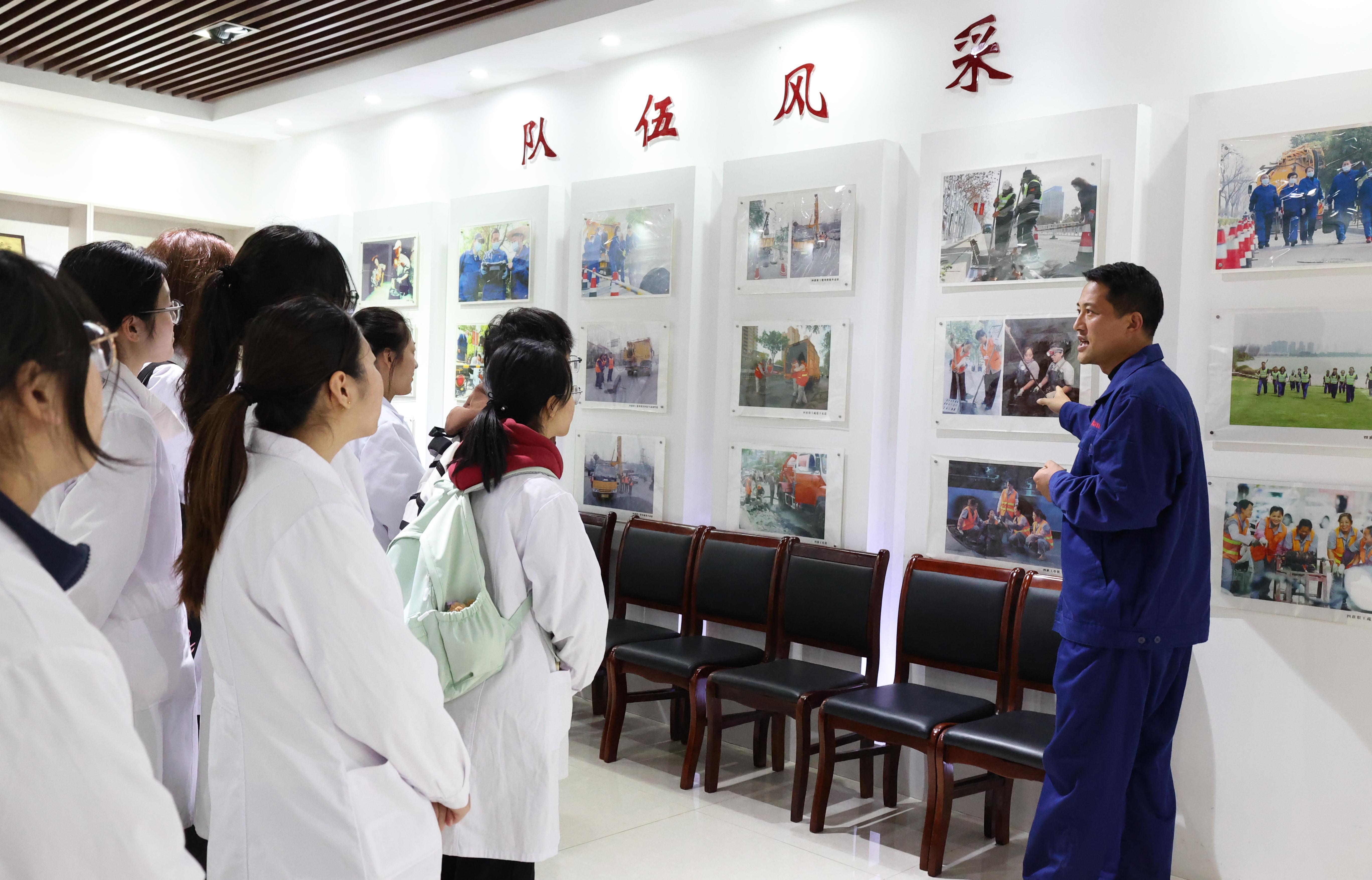 活动伊始,下水道四班班长对师生一行的到来表示热烈欢迎,并详细介绍了四班五十余载扎根城市“地下血脉”养护一线的奋斗历程。在班长的引导下,师生们走进承载着厚重荣誉的“场馆里的思政课”现场,驻足于“全国五一劳动奖状”“全国工人先锋号”等荣誉墙前。一张张记录管网养护、防汛抢险的老照片,无声讲述着一线工作者“宁可脏一人,服务千万家”的敬业精神与奉献情怀。此次参观不仅是历史的回望,更是依托“馆校协同”机制,将基层资源转化为思政实践教学点的生动体现,让师生在历史与现实的交汇中,切实体悟奋斗的力量,实现了理论学习与情感共鸣的双向赋能。
