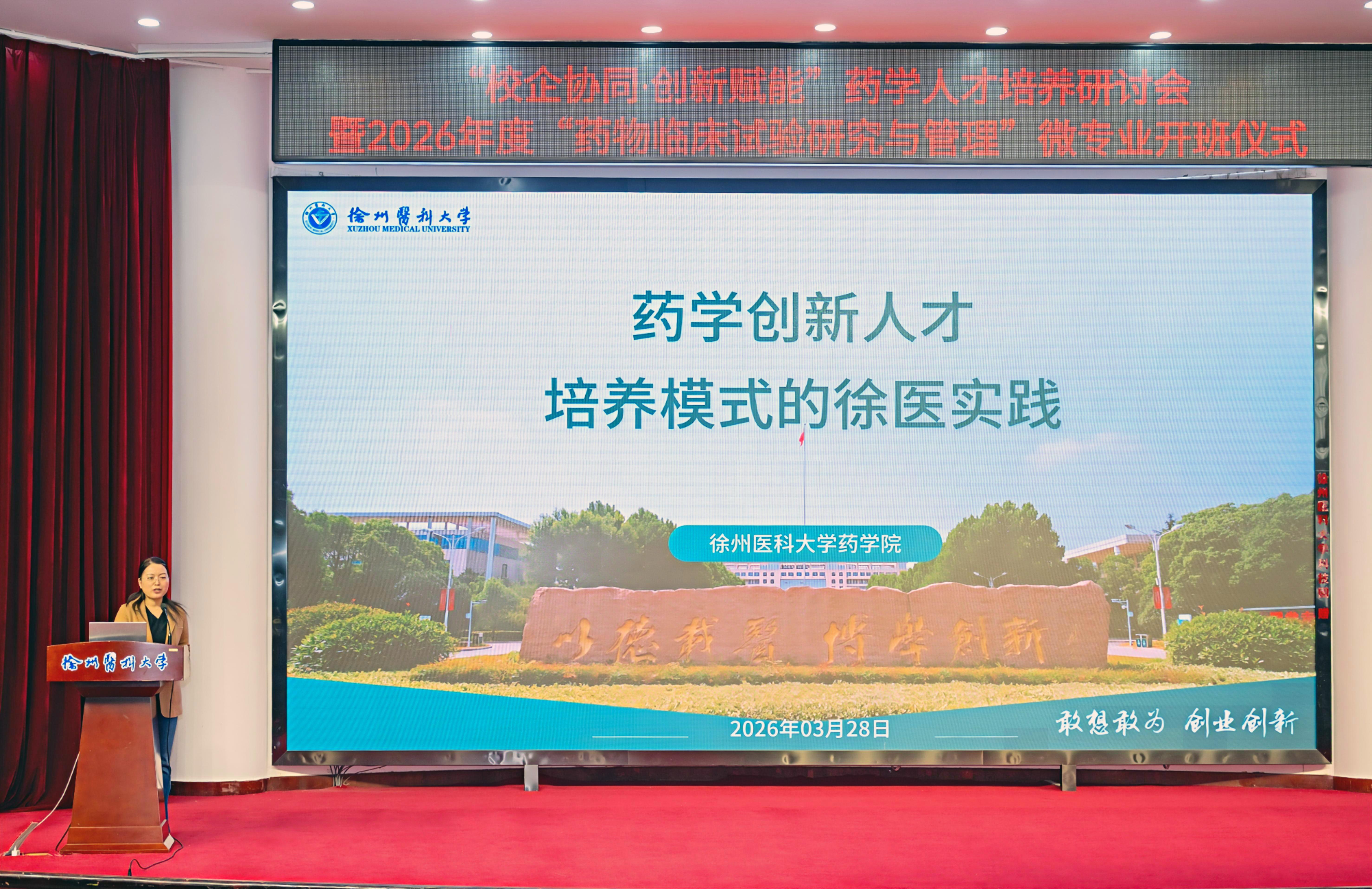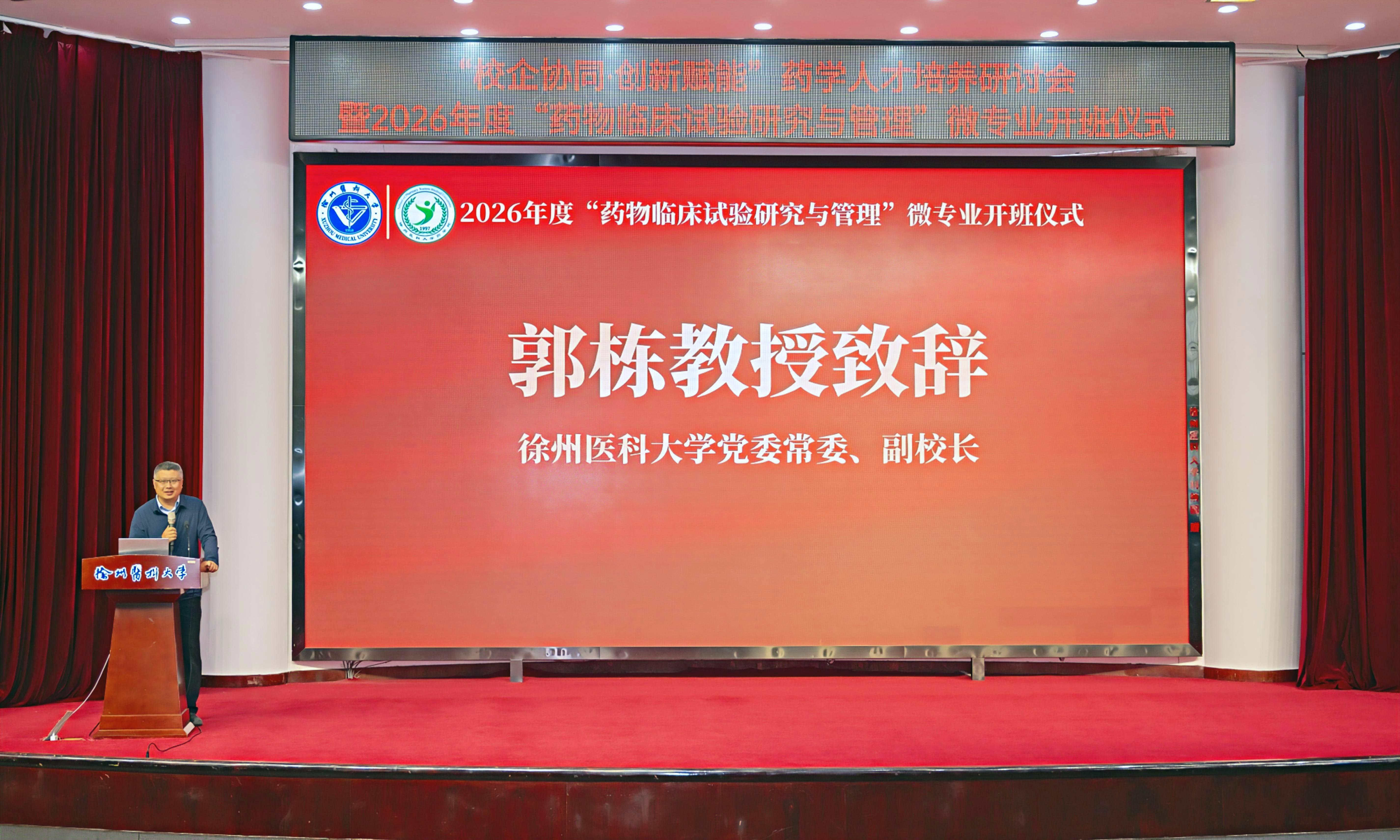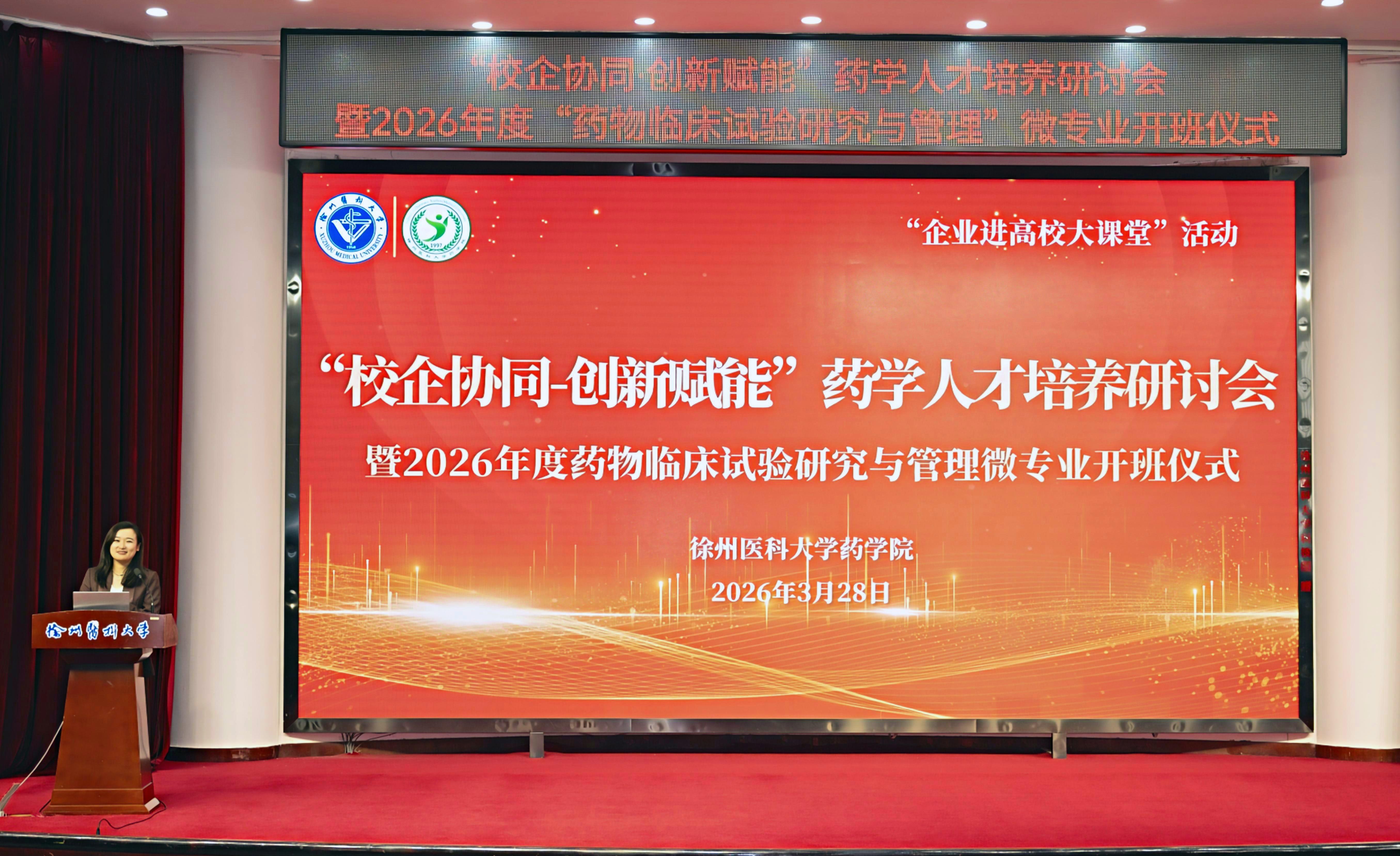 3月28日上午,徐州医科大学“校企协同·创新赋能”药学人才培养研讨会暨2026年度“药物临床试验研究与管理”微专业开班仪式在主校区学术报告厅举行。校党委常委、副校长郭栋,教务处副处长赵子明,药学院领导班子,政府监管部门、医药企业、医疗机构代表等齐聚一堂,共话药学创新人才培养新路径,共谋产教融合、医教协同发展新篇章。会议由药学院院长周雪妍主持。