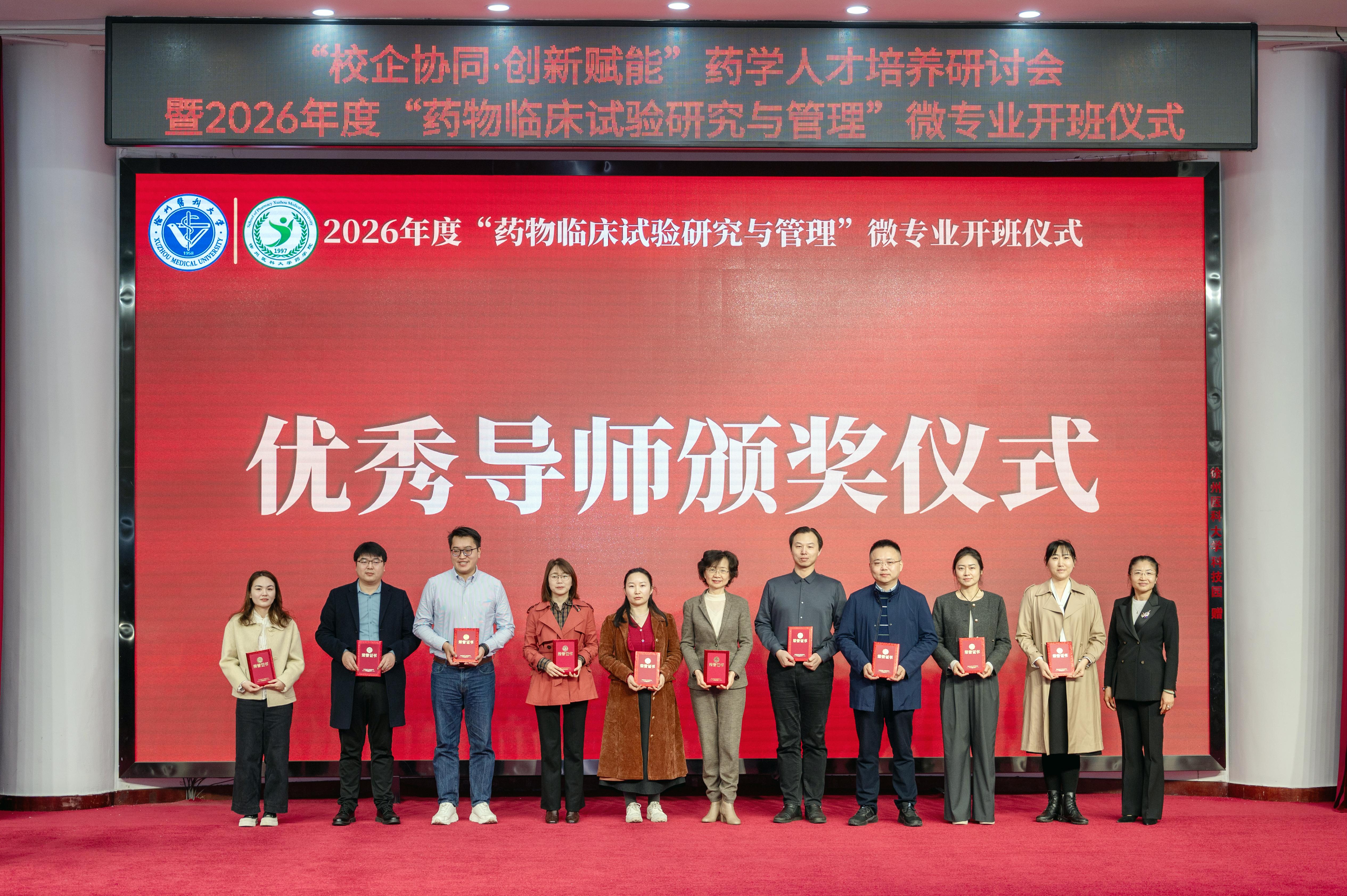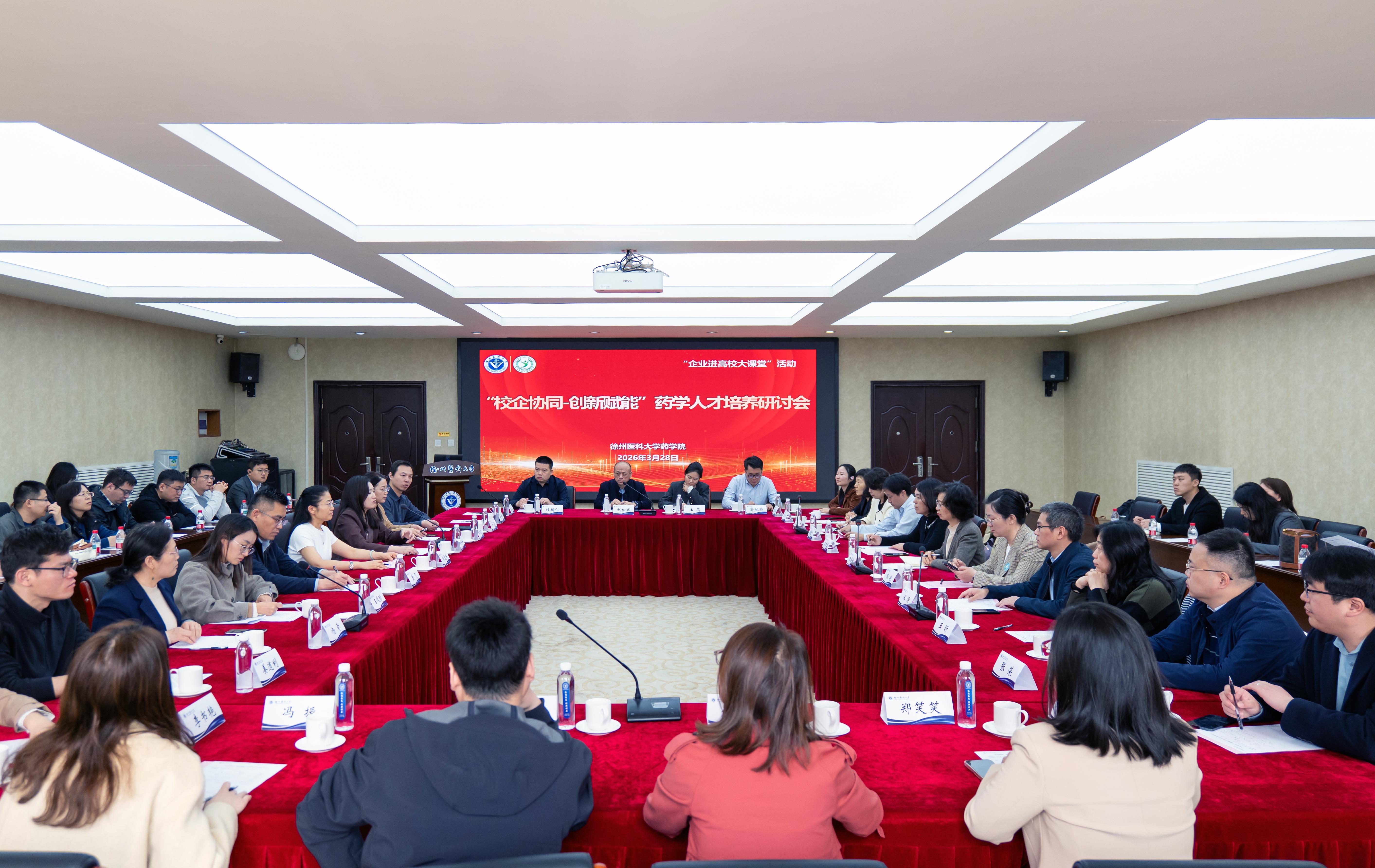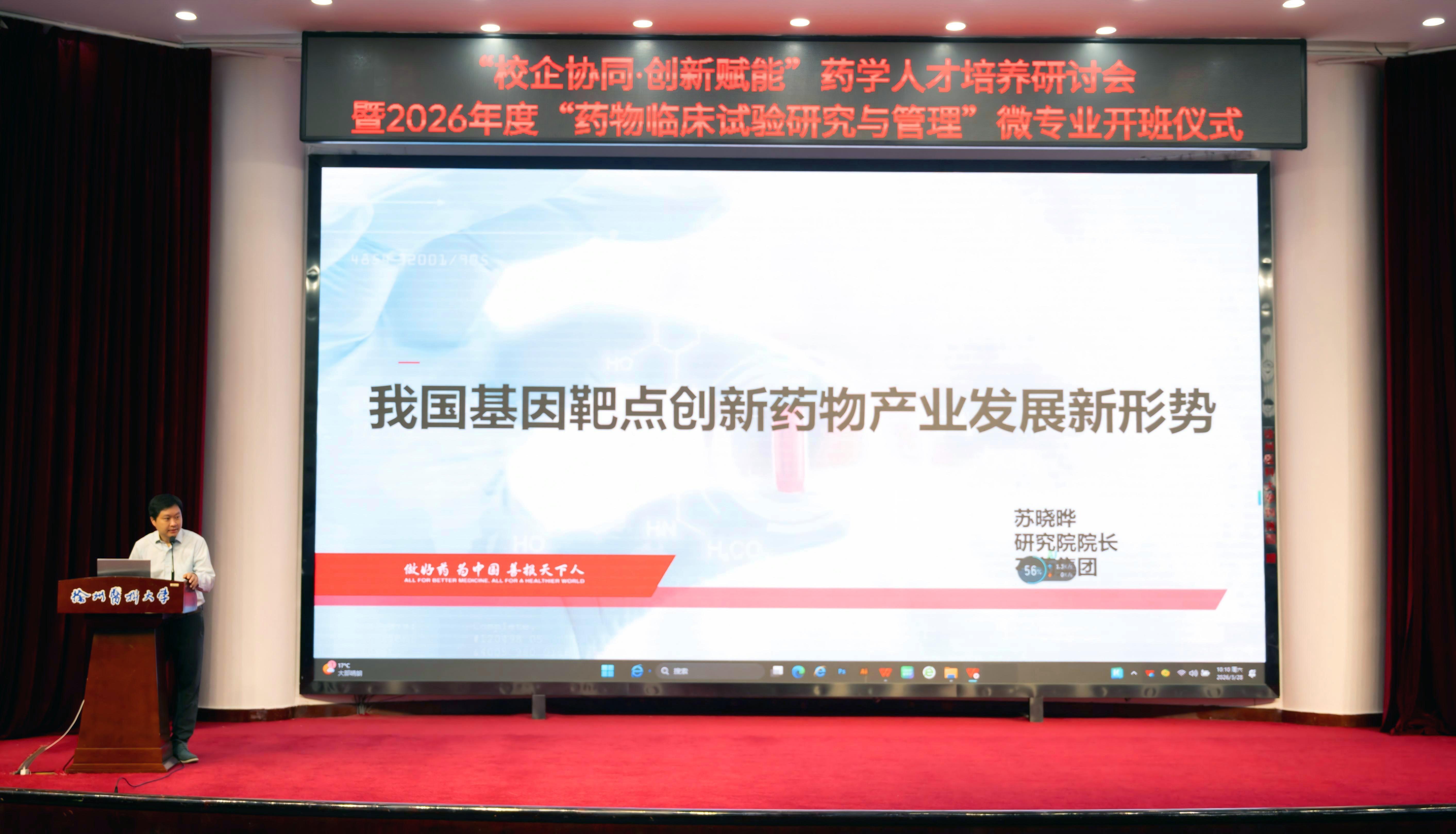 3月28日上午,徐州医科大学“校企协同·创新赋能”药学人才培养研讨会暨2026年度“药物临床试验研究与管理”微专业开班仪式在主校区学术报告厅举行。校党委常委、副校长郭栋,教务处副处长赵子明,药学院领导班子,政府监管部门、医药企业、医疗机构代表等齐聚一堂,共话药学创新人才培养新路径,共谋产教融合、医教协同发展新篇章。会议由药学院院长周雪妍主持。