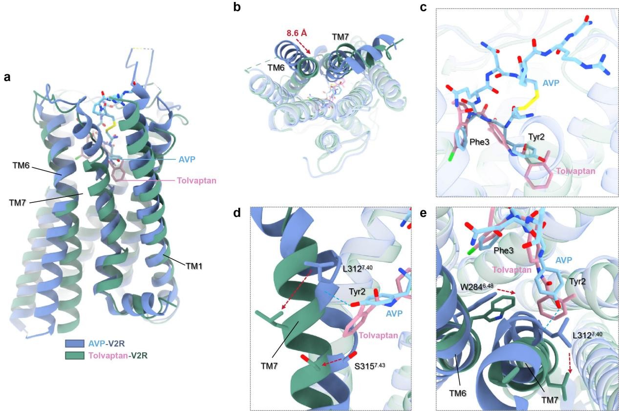 图4.非活性托伐普坦-V2R与活性AVP-V2R复合物的结构对比