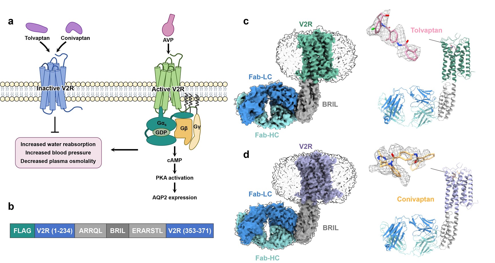 图1. V2R与托伐普坦及考尼伐坦结合的冷冻电镜结构