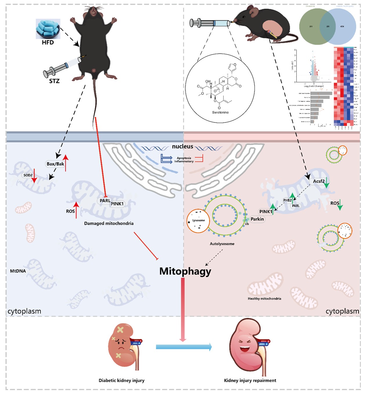 DN是糖尿病的常见并发症。全球超30%-40%的糖尿病患者会进展为DN,最终发展为终末期肾病。肾小管损伤是其核心病理特征之一,而线粒体功能障碍、线粒体自噬不足是肾小管损伤的关键诱因,但相关调控机制尚未完全明确。本课题组前期已证实Swi其具有抗炎、抗氧化及肾脏保护作用,但其改善DN肾小管损伤的具体机制仍待解析。通过本研究结果证实,Swi可显著改善DN小鼠肾脏功能和病理损伤、缓解胰岛素抵抗;同时,Swi还可降低氧化应激和细胞凋亡水平,激活线粒体自噬并最终缓解DN肾小管损伤。本研究通过TMT蛋白组学联合网络药理学进行数据挖掘,确定其可通过激活 Acsf2/PHB2/PINK1通路增强线粒体自噬,缓解DN肾小管损伤,缓解糖尿病肾病。这与本课题组先前在《Journal of Ethnopharmacology》(Duan et al., 2025)(中科院药学1区),发表的研究成果共同证实了Swi对DN小鼠的肾小管以及肾小球都具有较好的保护作用。本研究为Swi作为DN的防治候选药物提供了新的理论依据,也为Swi治疗其他糖脂代谢紊乱性疾病提供了新的思考。