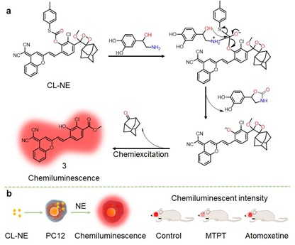 帕金森病作为常见的神经退行性疾病,其病理进程与去甲肾上腺素系统的功能紊乱密切相关。NE在中枢神经系统中参与调控觉醒、运动、认知等多种功能,其水平异常与PD运动障碍、认知衰退等密切相关。目前,NE的检测方法如液相色谱、质谱等存在操作复杂、无法实时原位监测等局限,而传统荧光探针则受限于光漂白、组织穿透性差及背景干扰等问题。因此,开发一种无需外源激发、高信噪比且适用于活体成像的NE检测工具具有重要科学意义与临床价值。