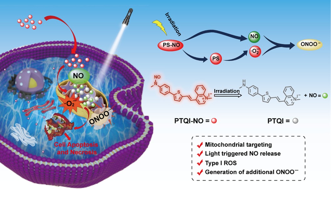 研究团队巧妙地将一氧化氮供体(亚硝基)与I型光敏剂通过光可裂解的N-N键偶联,构建了具有D-π-A结构的单分子杂合体PTQI-NO。该分子在未光照时不释放一氧化氮,经光照后,不仅能够可控释放一氧化氮气体分子,还能同步产生超氧阴离子自由基(•O₂⁻),两者进一步发生级联反应生成高毒性的过氧亚硝酸盐(ONOO⁻),实现了“一光双机制、三活性物种”的协同抗肿瘤效果。该分子具有优异的线粒体靶向能力,可精准区分肿瘤细胞与正常细胞。在乳腺癌(如MCF-7细胞)等多种癌症模型中均展现出显著且选择性的光毒性和低暗毒性,并在斑马鱼模型中实现了NO释放的动态荧光监测。在治疗乳腺癌、甲状腺癌等浅表性癌症方面具有重要的临床价值和独特优势。