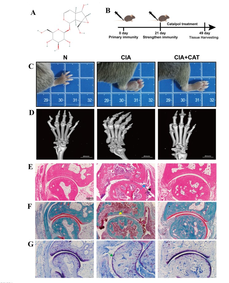 类风湿关节炎是一种慢性自身免疫性疾病,以持续性滑膜炎症与进行性关节破坏为主要特征,全球患病率约为0.25%-1%。目前临床应用的药物如非甾体抗炎药、糖皮质激素及生物制剂等,存在副作用显著、治疗成本较高等局限,因此亟需研发新型治疗药物。梓醇(Catalpol)属于环烯醚萜苷类活性成分,主要来源于传统中药地黄(Rehmannia glutinosa)及车前草等,具有抗炎、抗氧化、免疫调节等多种药理活性。本研究以梓醇这一传统中药活性成分为研究对象,综合运用胶原诱导型关节炎动物模型、显微CT成像、转录组测序及分子生物学等现代技术手段,首次从PAD4介导的中性粒细胞胞外陷阱(NETs)调控通路角度,系统阐明了梓醇治疗类风湿关节炎的作用机制。该研究路径既承袭了中药“多靶点、整体调节”的固有优势,又实现了对关键作用靶点及信号通路的精准解析,使传统中药的疗效具备可量化、可验证的科学表征,这也是首次将梓醇的抗炎作用与NETs调控机制直接关联。